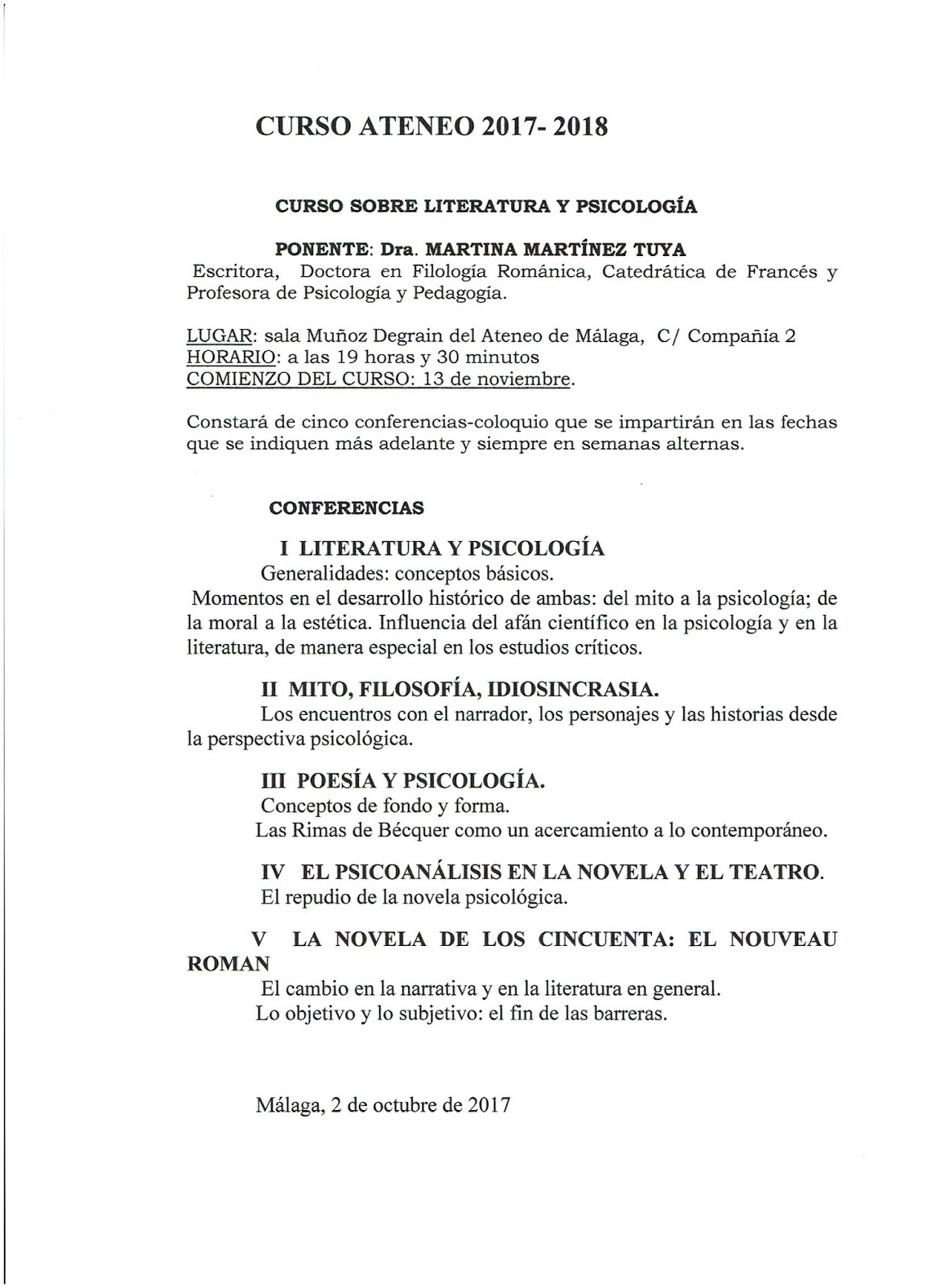 Como cada año nuestra socia y amiga la Drª Martina Martínez Tuya inicia su ciclo de conferencias sobre Literatura y Salud Mental, este año con nuevo giro muy interesante.